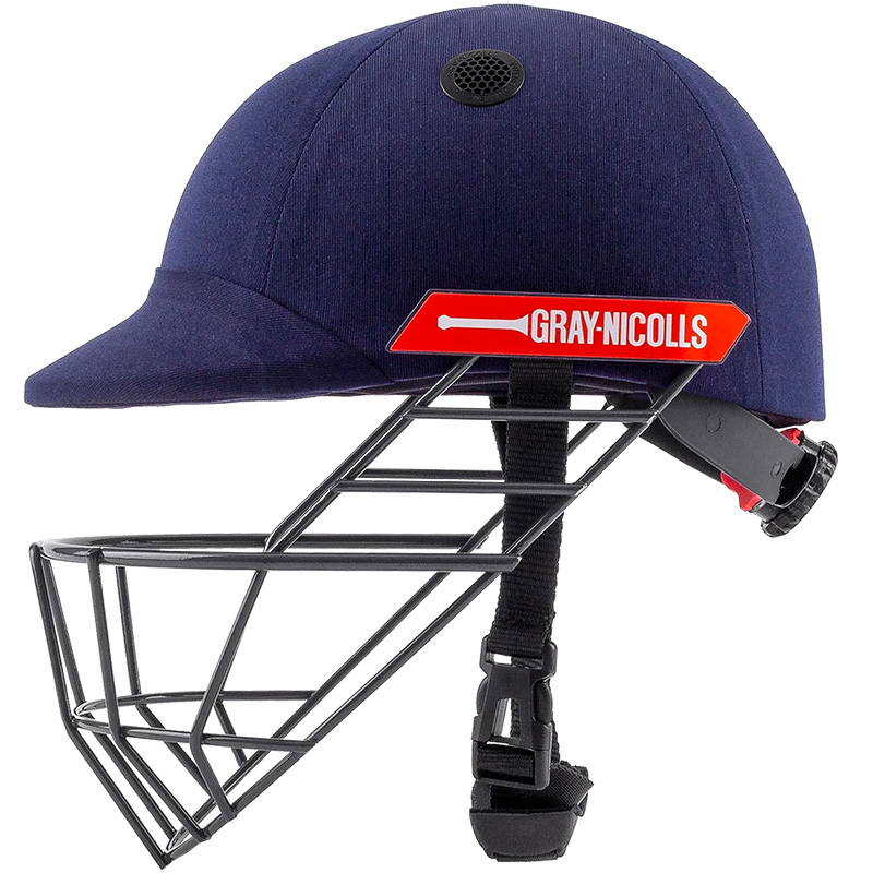 - Traditional cricket helmet with a reinforced peak.